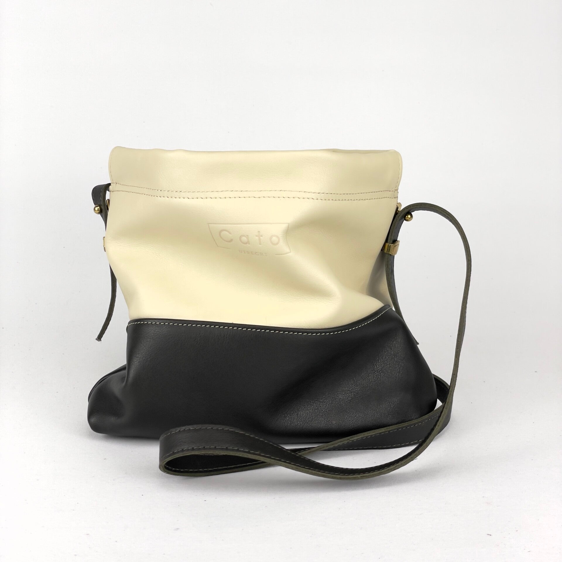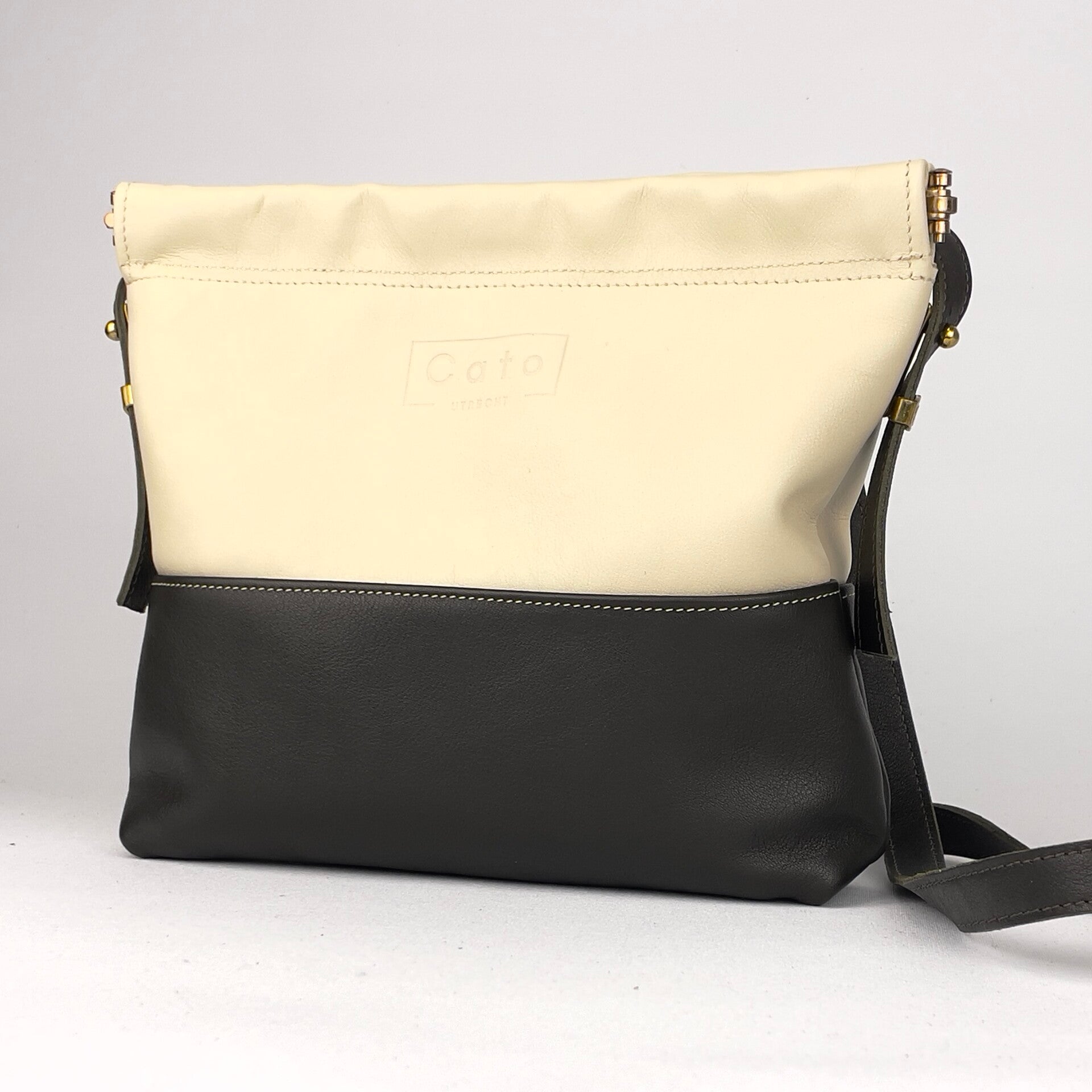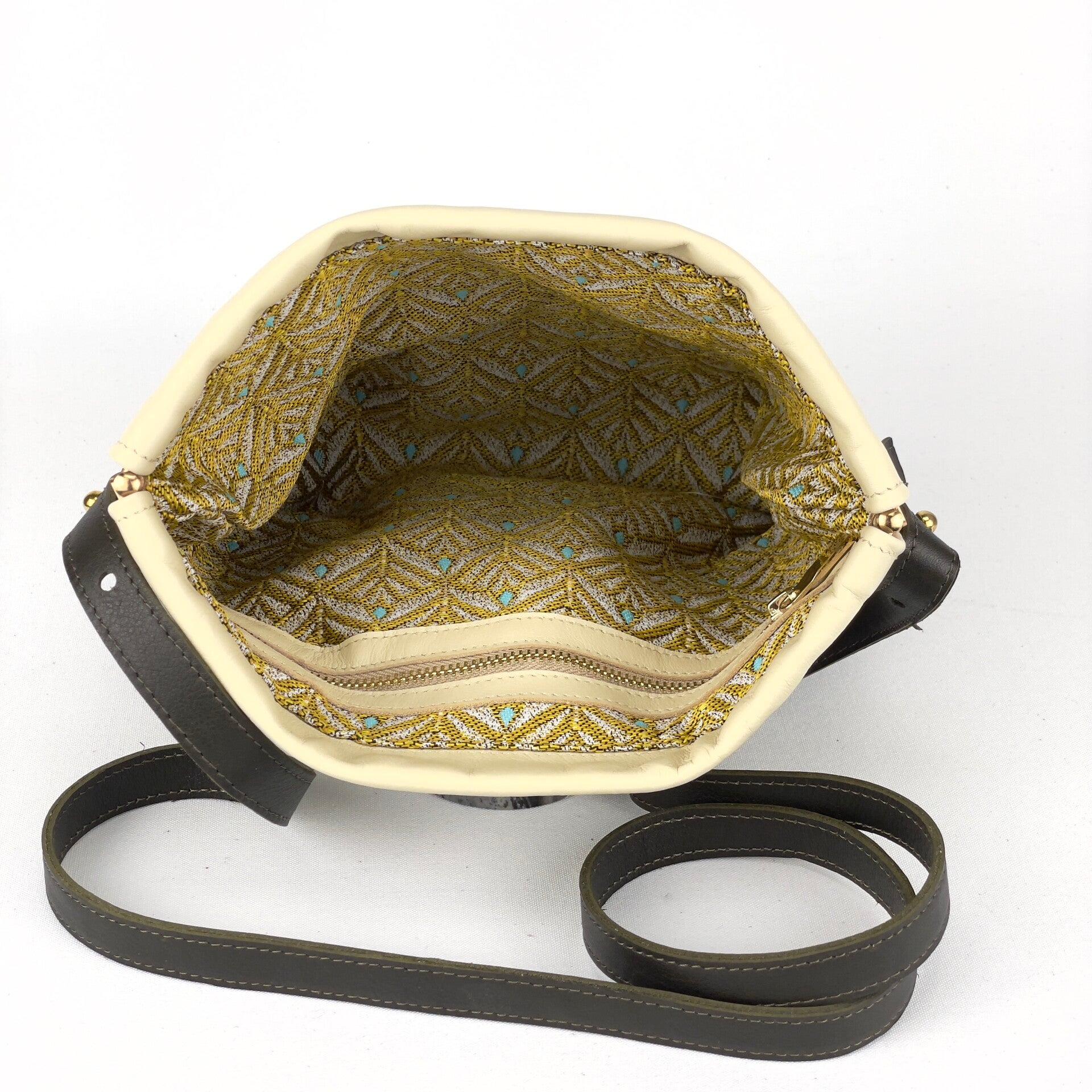 Een praktisch tasje van donkergroen en beige kalfsleer dat opent en sluit met een klikveer. Het verstelbare draagriempje is bevestigd aan geweerknopjes met geleiders in bronskleur. De voering van glanzend jacquard geeft deze tas een chique twist. Een ritsvakje binnenin voor kostbaarheden.