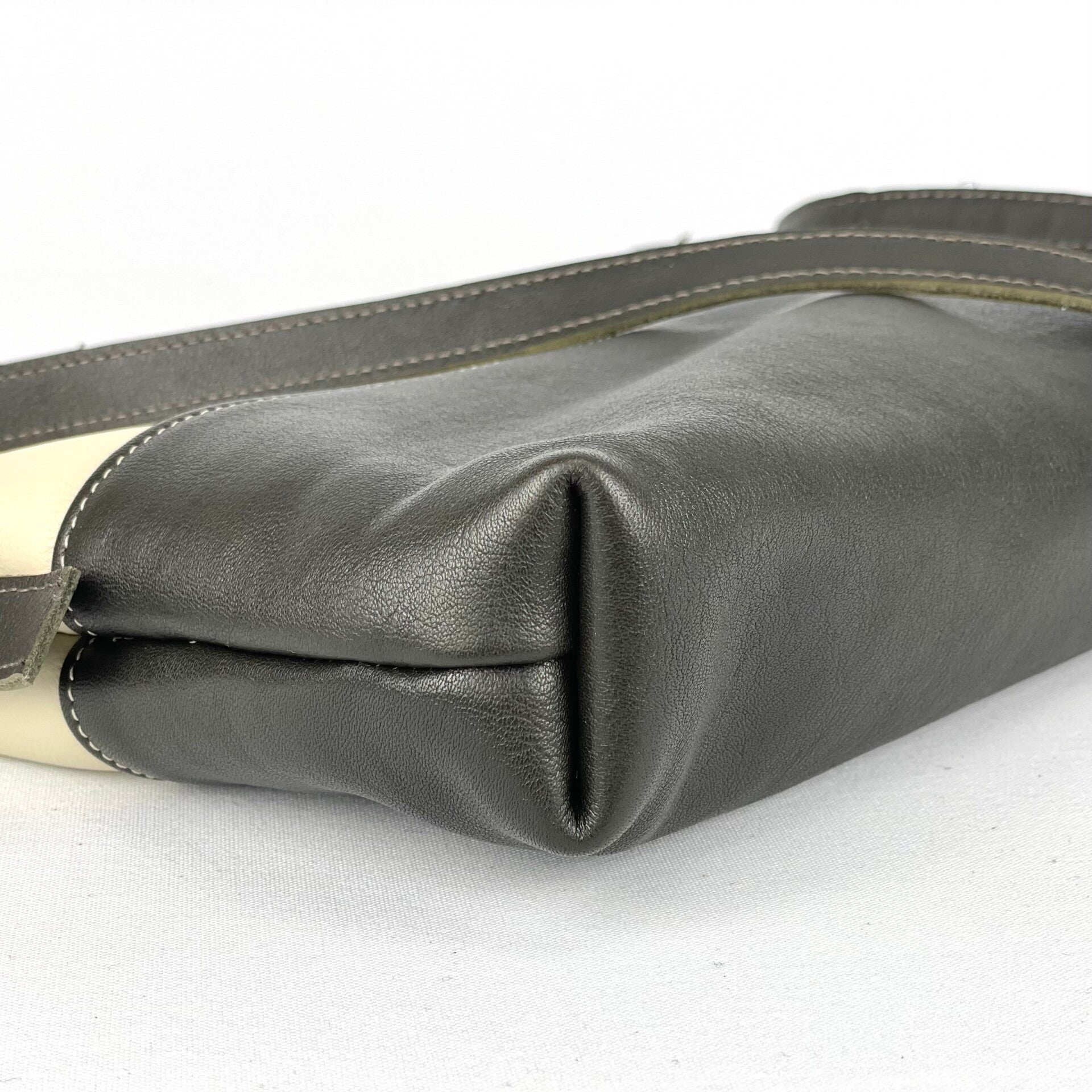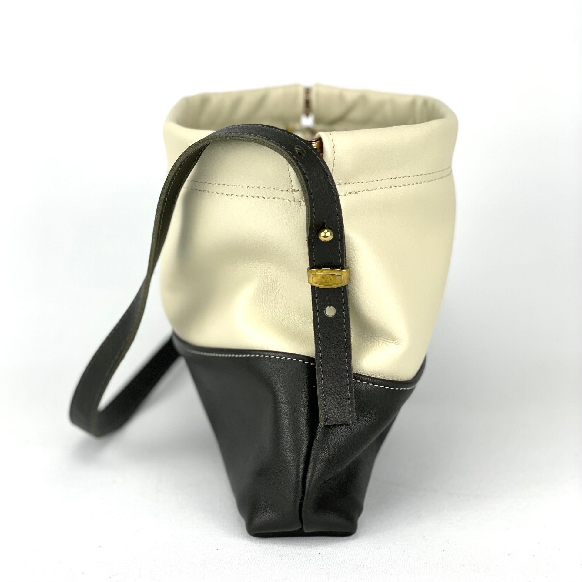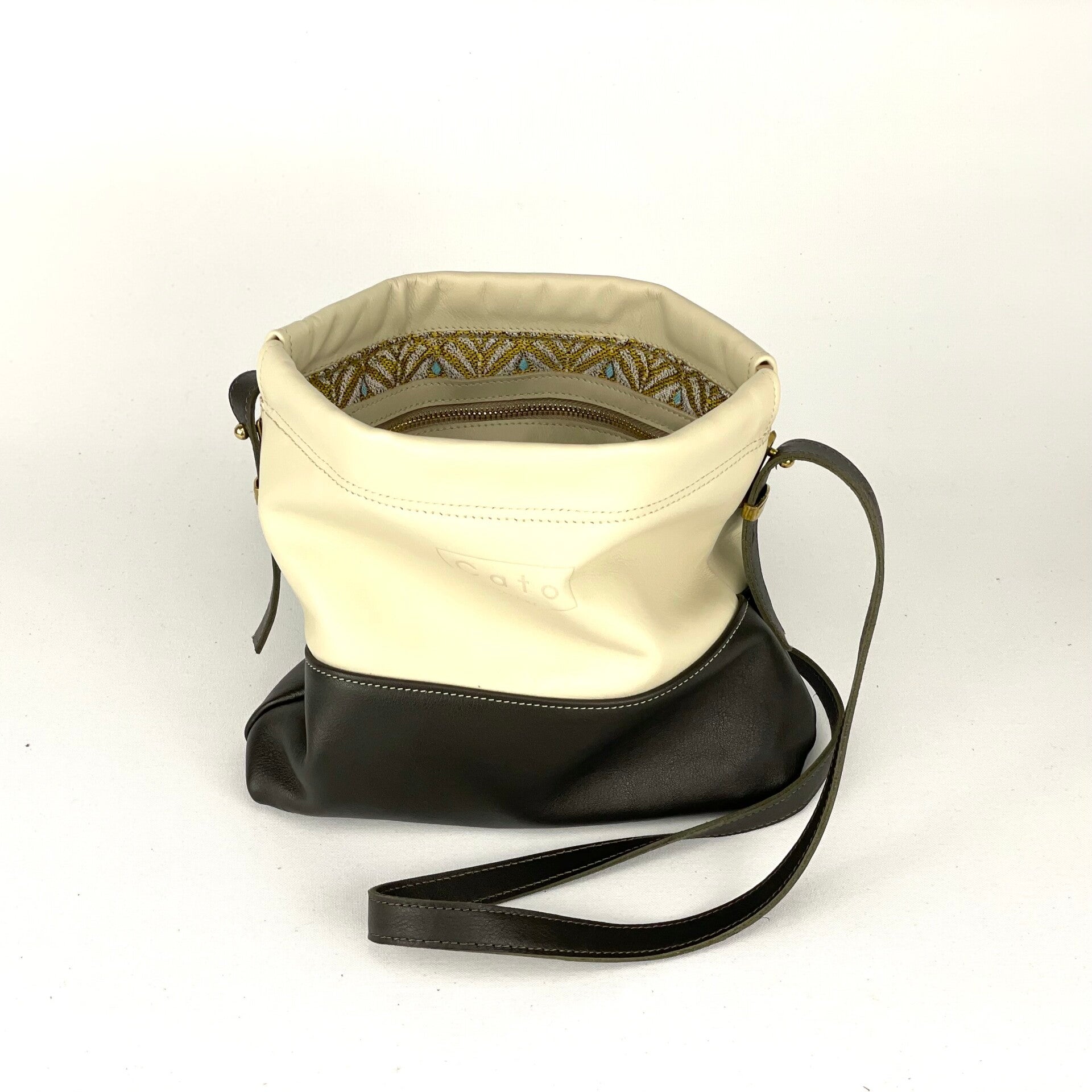 Een praktisch tasje van donkergroen en beige kalfsleer dat opent en sluit met een klikveer. Het verstelbare draagriempje is bevestigd aan geweerknopjes met geleiders in bronskleur. De voering van glanzend jacquard geeft deze tas een chique twist. Een ritsvakje binnenin voor kostbaarheden.